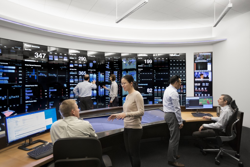 Dalmore Capital Risk Management Center provides a comprehensive view of the various investment portfolios and how they fit within pre-established guidelines. Built in 2014, its front-end consists of a 27' by 8' interactive touchscreen designed to visualize data in ways that allow for rapid comprehension. Its back-end systems, which connect to every Dalmore Capital office worldwide, continuously run a wide range of operational readiness, risk, and stress test monitors.
